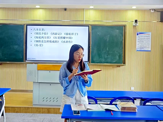 随后,初二语文备课组长朱谷华老师,分享无锡市“新课标・新教材・新教学”研讨暨八年级(上)新教材培训要点。她指出,新教材“整本书阅读”取代原“名著导读”,需引导学生深入探究书名含义、制作整合式读书卡片,而非碎片化提取信息;单元后的“阅读综合实践”不可忽略,倡导通过小组合作、问题探究深化学习。